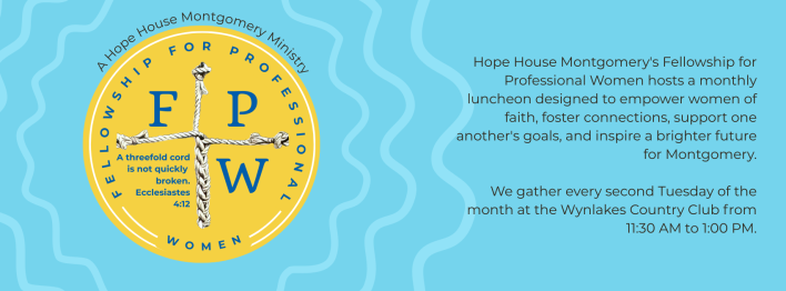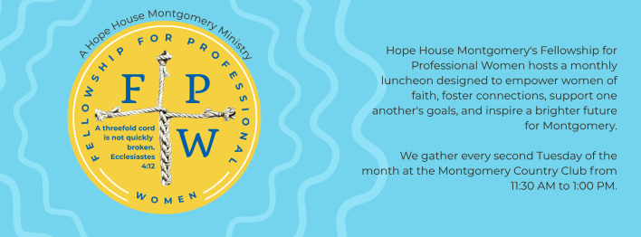 Join us for a monthly luncheon at Hope House Montgomery’s Fellowship for Professional Women, designed to strengthen women of faith, connect, uplift each other’s endeavors, and inspire a brighter future for Montgomery.